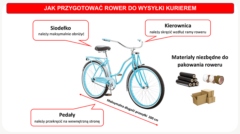 - Jak zapakować rower? Odkręć przednie koło, pedały i poluzuj kierownicę, obracając ją wzdłuż ramy. Wszystkie małe elementy umieść w osobnym woreczku. Całość, a zwłaszcza delikatne części jak przerzutki, owiń grubą warstwą folii bąbelkowej lub tektury. Najlepiej umieścić rower w specjalnym kartonie rowerowym. Po więcej szczegółów zapraszamy do naszego dedykowanego poradnika: jak wysłać rower kurierem.
